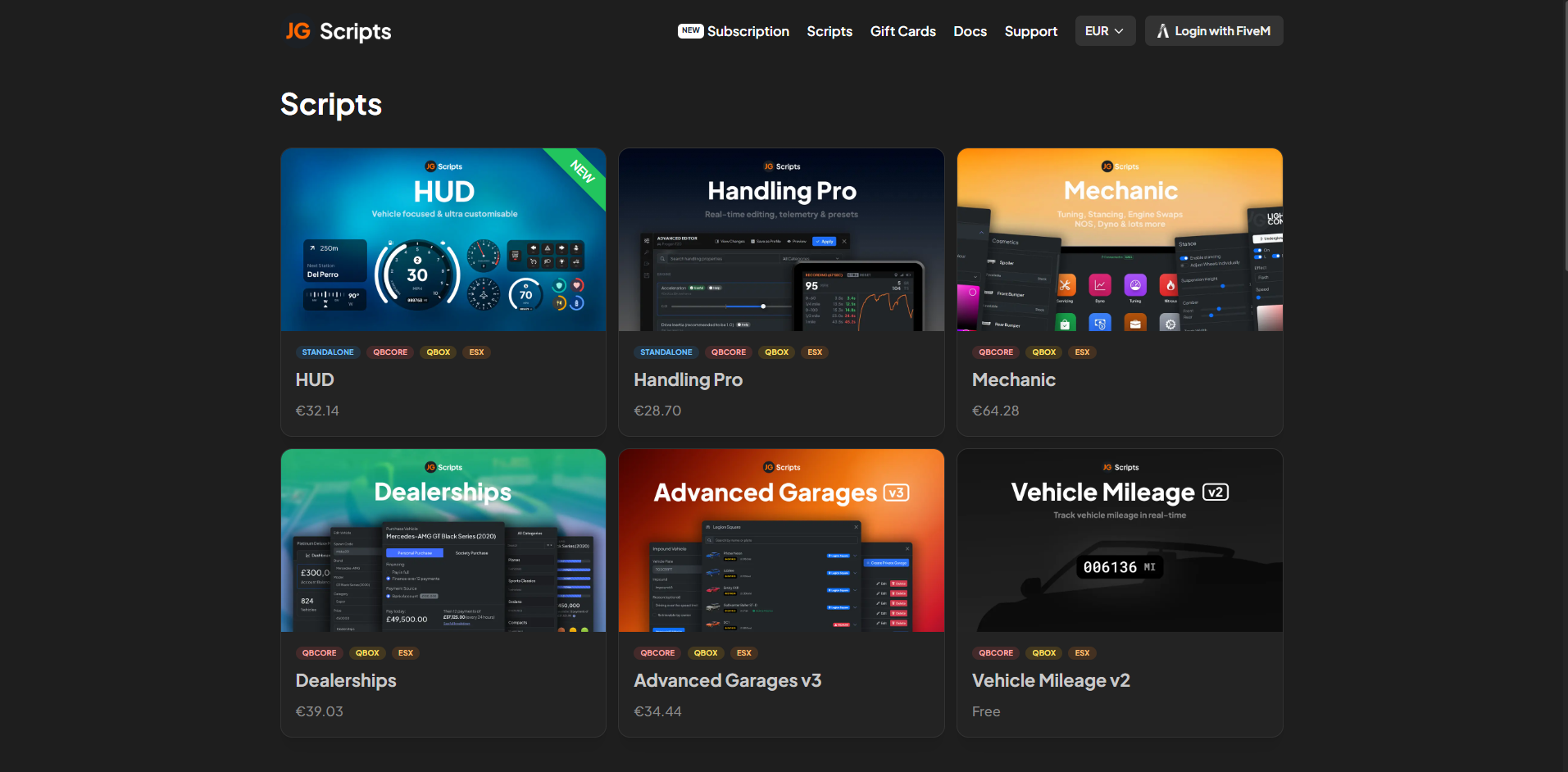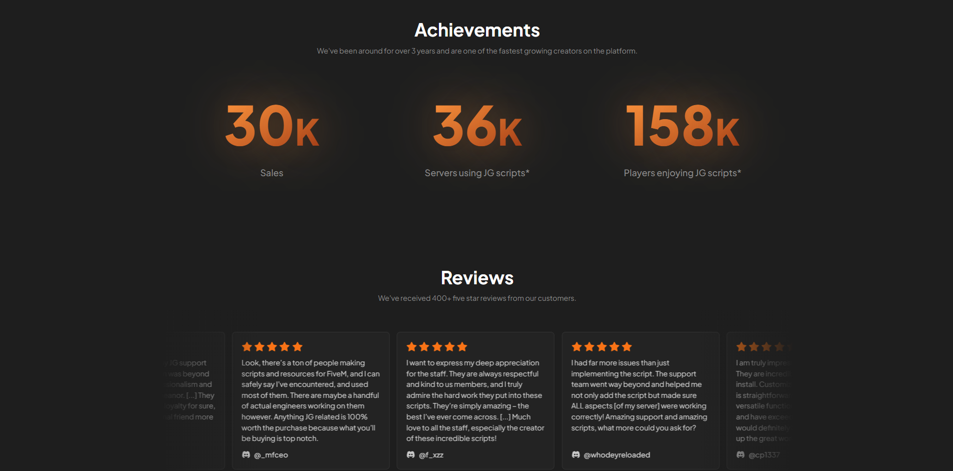 I’ve been running JG Scripts for over three years. The first script was something I’d already built for our RP server, so polishing and expanding it only took about two weeks before it went public. We prioritize quality over quantity – while we only offer five products, some took extensive time to develop. For instance, our flagship script, JG Mechanic, took over six months of full-time work.